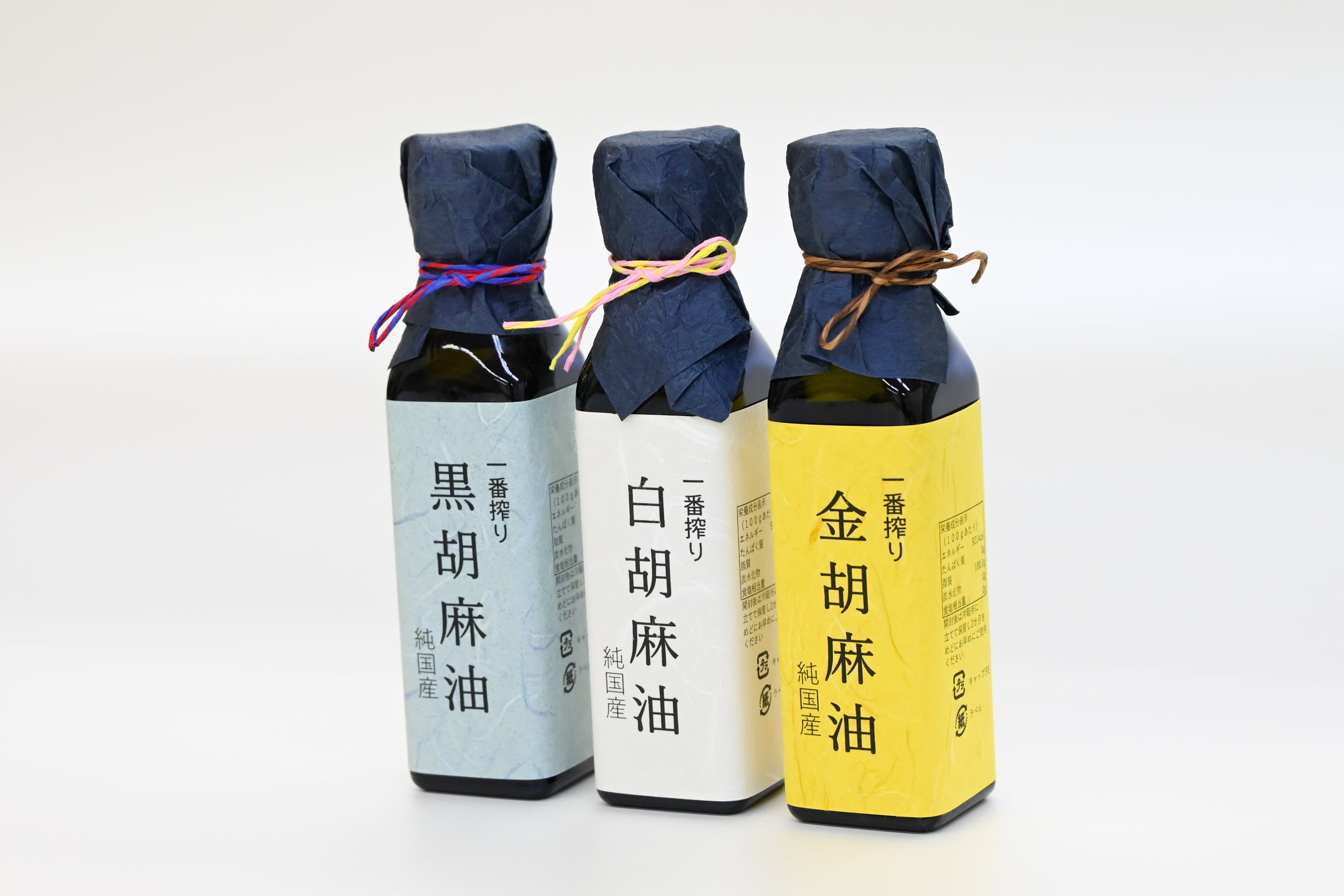 国内産ならではの安心感と新鮮さをお届けしたく【黒・白・金】の3種類の胡麻油を搾りました